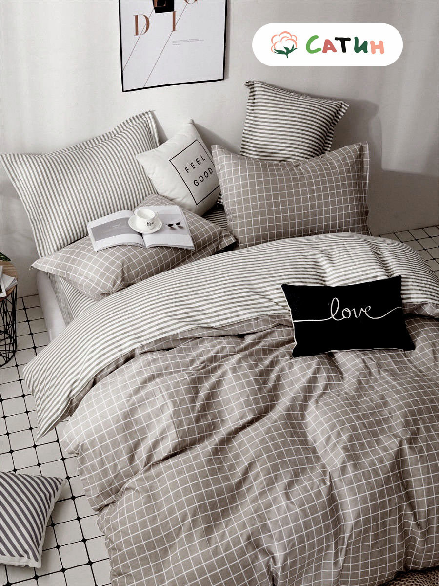 Красивый комплект постельного белья из мягкого сатина. Пододеяльник и наволочки на молнии. Простыня и обратная сторона пододеяльника выполнена из ткани-компаньона. Натяжная простыня в комплекте рассчитана на высоту матраса до 26 см. Резинка вшита в торцевые стороны с переходом на продольные стороны по 35 см. Сатин - это 100% хлопковый материал с особым переплетением нитей, которое придает ткани нежный блеск и плотную структуру. Ткань очень износостойкая и прочная, при этом легкая и мягкая, не скатывается и не электризуется, гигиеничная и гипоаллергенная, сохраняет свой первоначальный вид и цвет при стирке с температурой воды до 40 градусов. Произведено в России. Вы можете собрать из нашей продукции комплект постельного белья на свой вкус по индивидуальным размерам, выбрав интересующую расцветку ткани, размер пододеяльника, наволочек, тип и размер простыни.